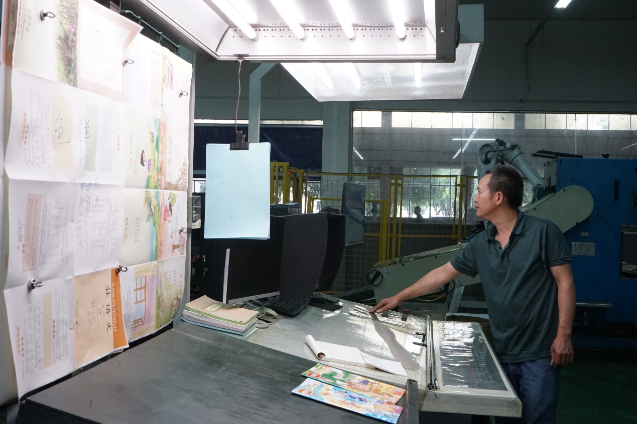 在印前车间,李荣德老师带领同学们参观打样设备和制版设备,详细讲解工作人员如何根据客户需求完成图文设计、排版校对和制版打样。同学们近距离观察印刷模板,了解了出版物的“诞生”起点。